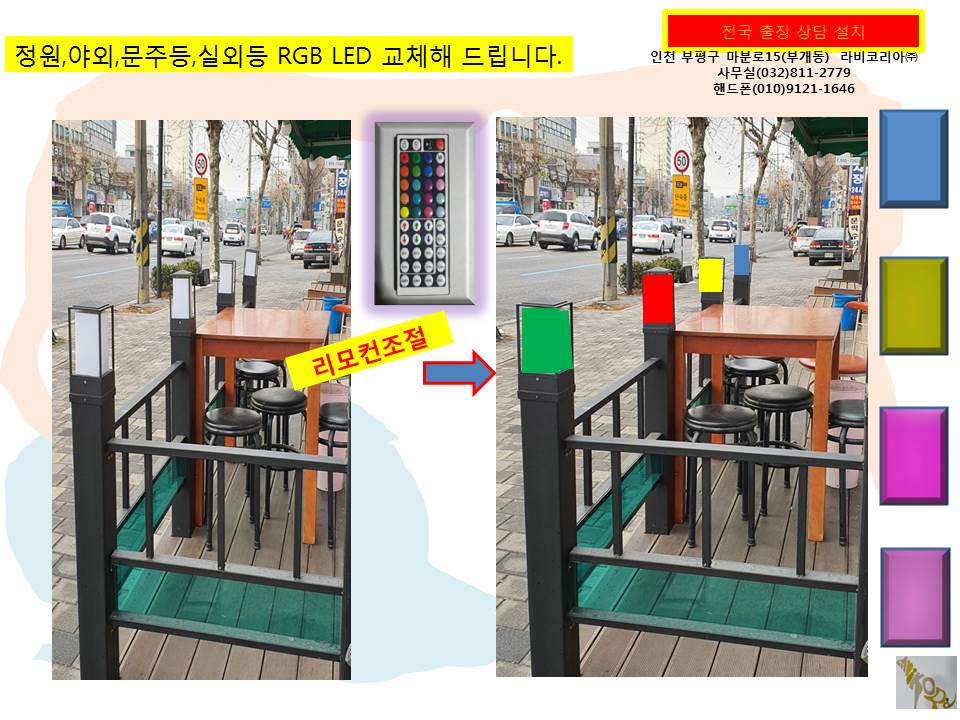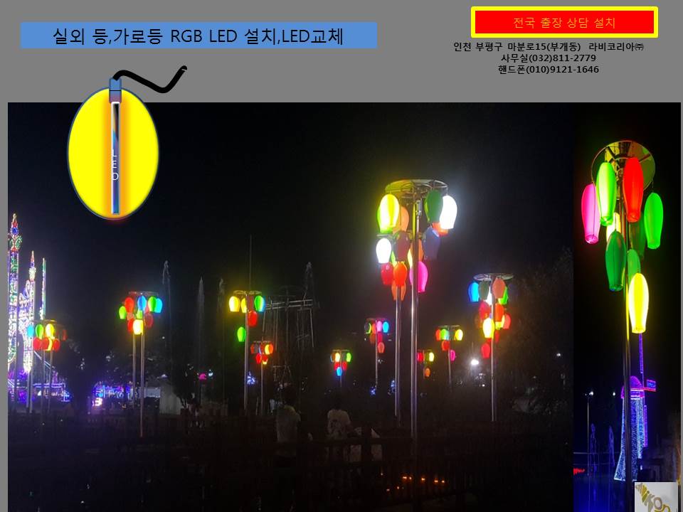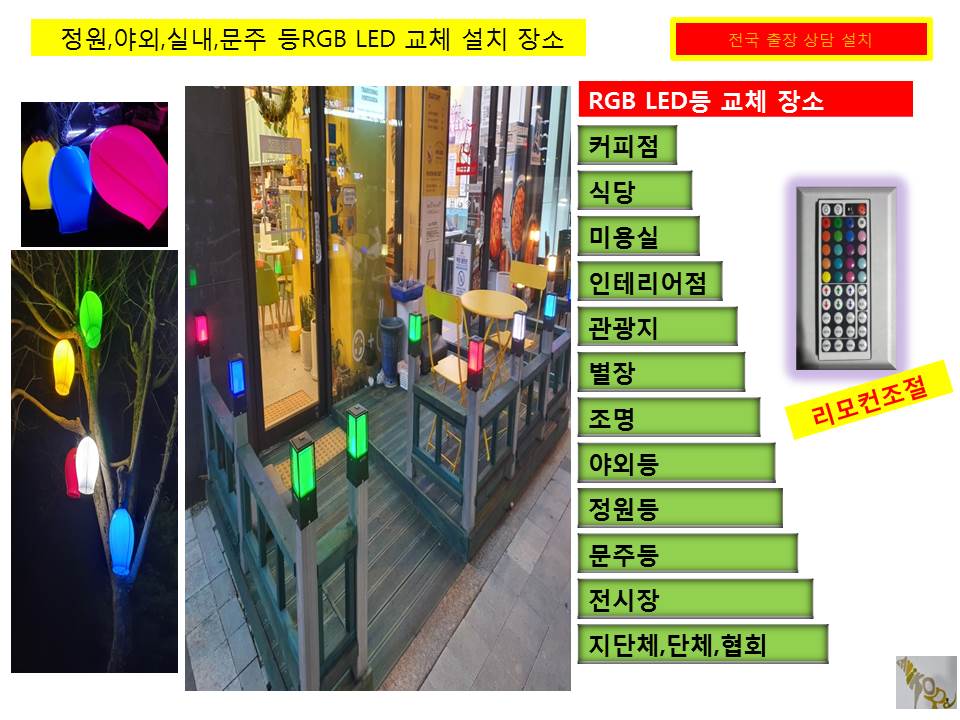 설치 장소는 커피점,식당,미용실,인테리어점,관광지,별장,조명가계,야외등,정원등,문주등,전시장,행사,축제장 RGB LED교체 및 설치해드림니다.