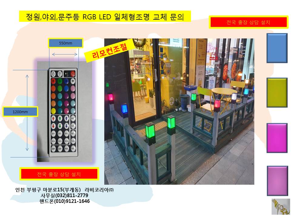 설치 장소는 커피점,식당,미용실,인테리어점,관광지,별장,조명가계,야외등,정원등,문주등,전시장,행사,축제장 RGB LED교체 및 설치해드림니다.