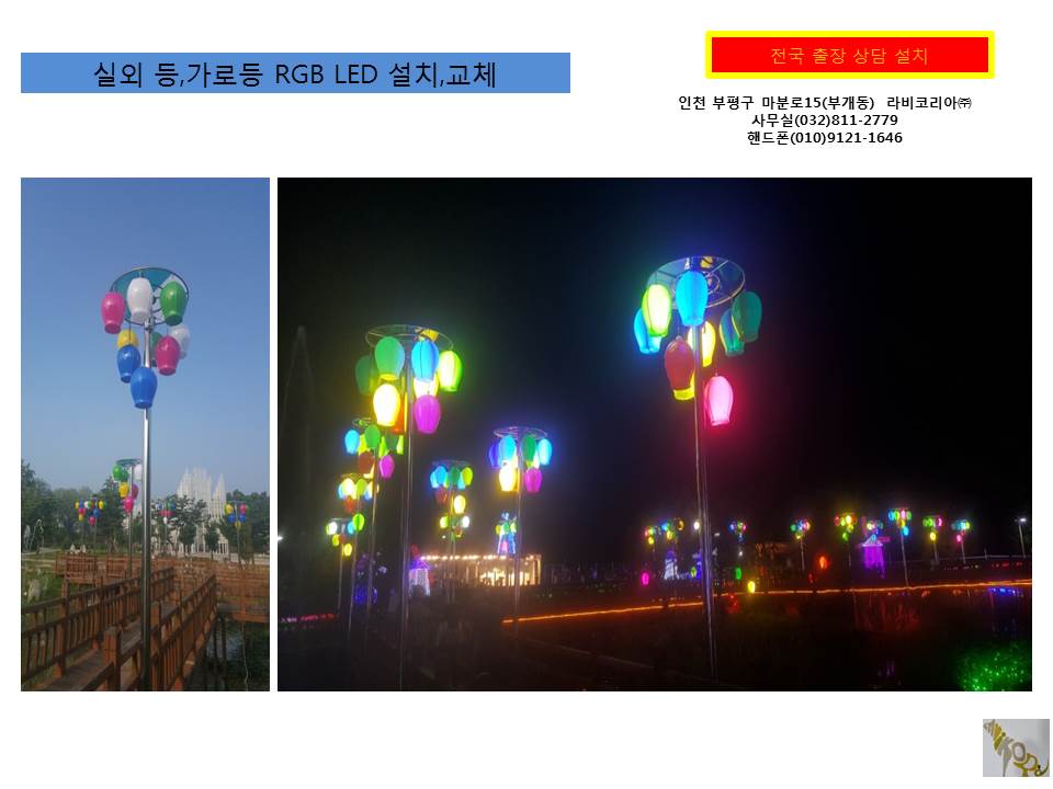 설치 장소는 커피점,식당,미용실,인테리어점,관광지,별장,조명가계,야외등,정원등,문주등,전시장,행사,축제장 RGB LED교체 및 설치해드림니다.