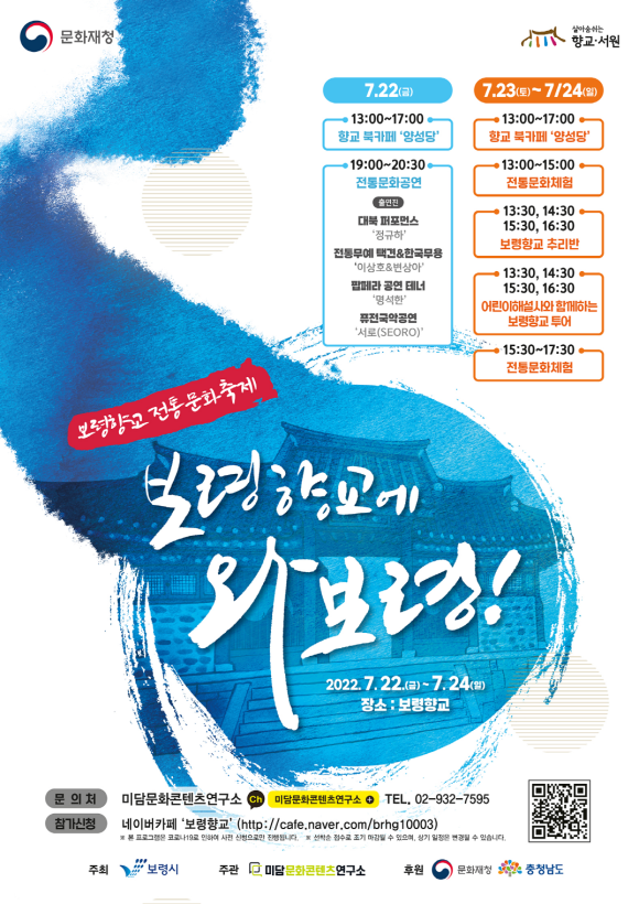 보령시는 22일부터 24일까지 3일간 보령향교에서 향교·서원 문화재 활용사업의 일환으로써 시민과 관광객들을 위한 특별한 향교 축제를 개최한다.